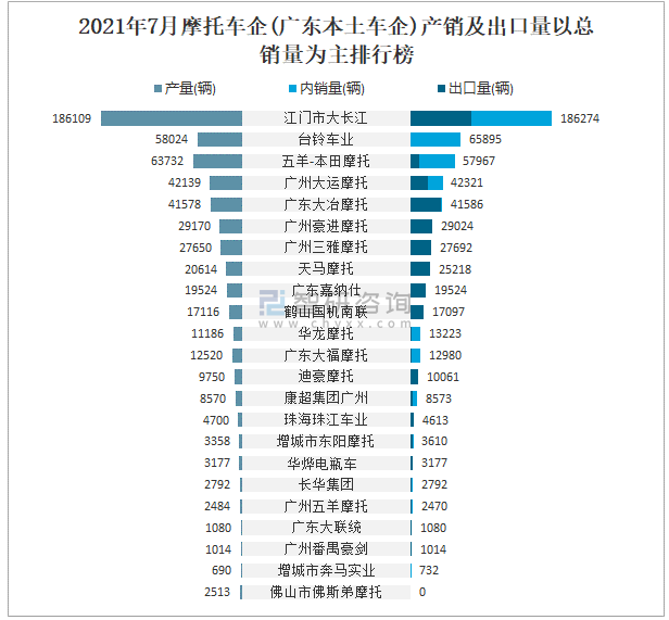 2021年7月摩托車(chē)企(廣東本土車(chē)企)產(chǎn)銷(xiāo)及出口量(以總銷(xiāo)量為主)排行榜