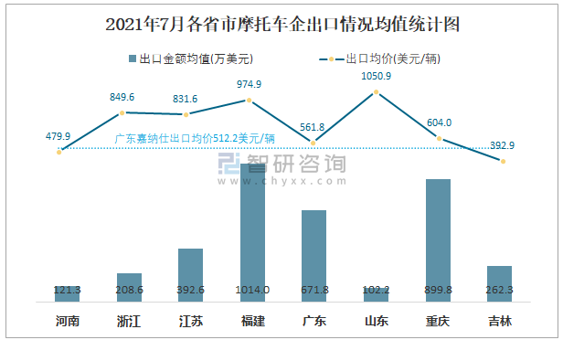 2021年7月各省市摩托車(chē)企出口情況均值統(tǒng)計(jì)圖