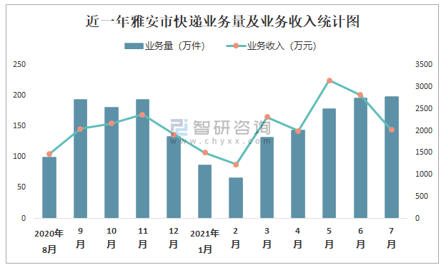 近一年雅安市快遞業(yè)務(wù)量及業(yè)務(wù)收入統(tǒng)計圖