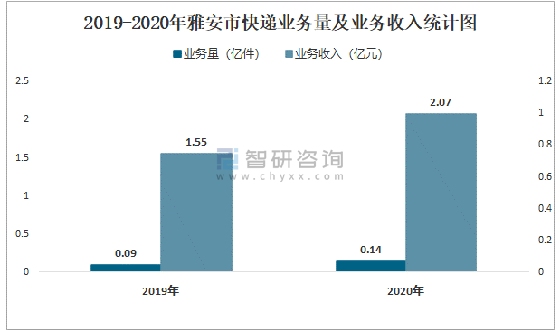 2019-2020年雅安市快遞業(yè)務(wù)量及業(yè)務(wù)收入統(tǒng)計圖