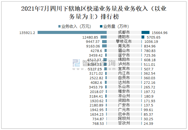 2021年7月四川下轄地區(qū)快遞業(yè)務(wù)量及業(yè)務(wù)收入(以業(yè)務(wù)量為主)排行榜