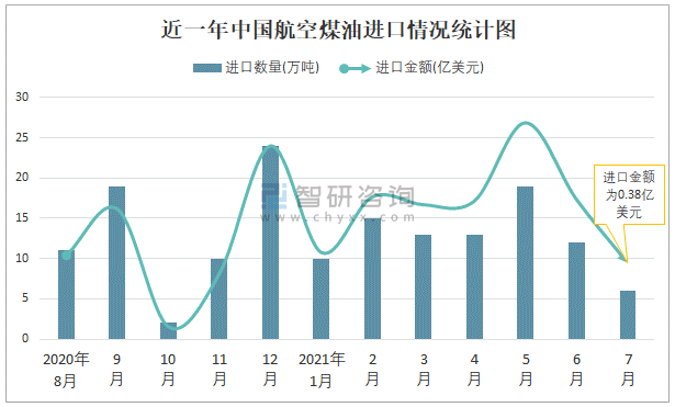 近一年中國航空煤油進口情況統計圖