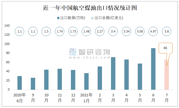根據中國海關數據顯示:2021年7月中國航空煤油進口數量為6萬噸,同比下降75.4%,進口金額為0.38億美元,同比下降53.8%,2021年7月中國航空煤油出口數量為66萬噸,同比增長109.3%,出口金額為3.8億美元,同比增長309%;2021年1-7月中國航空煤油進口數量為87萬噸,進口金額為4.64億美元,出口數量為439萬噸,出口金額為22.68億美元。