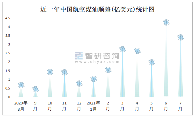 近一年中國航空煤油順差(億美元)統計圖