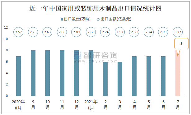 2021年7月中國家用或裝飾用木制品出口數(shù)量和出口金額分別為8萬噸和3.27億美元
