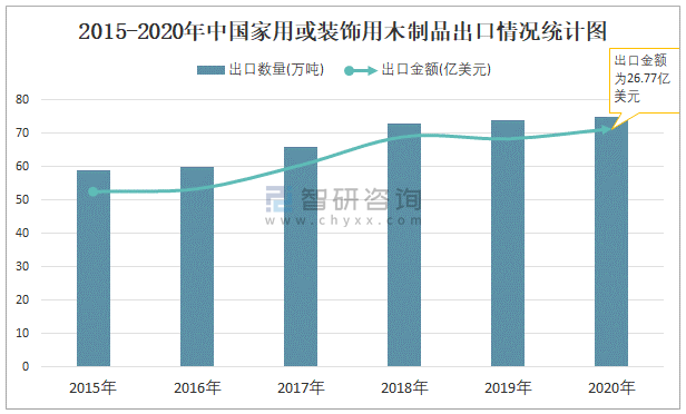 2015-2020年中國家用或裝飾用木制品出口情況統(tǒng)計(jì)圖
