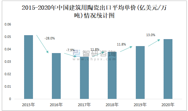 根據(jù)中國海關數(shù)據(jù)顯示:2015-2020年中國建筑用陶瓷出口數(shù)量逐年遞減,出口金額總體呈下降趨勢;2015-2020年中國建筑用陶瓷出口平均單價2020年增長速度最快,而2016年中國建筑用陶瓷出口平均單價下降速度最快,下滑了28.0%。