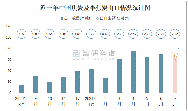 根據中國海關數據顯示:2021年7月中國焦炭及半焦炭出口數量為69萬噸,同比增長75.6%,出口金額為2.18億美元,同比增長160.3%;2021年1-7月中國焦炭及半焦炭,出口數量為410萬噸,出口金額為13.45億美元。