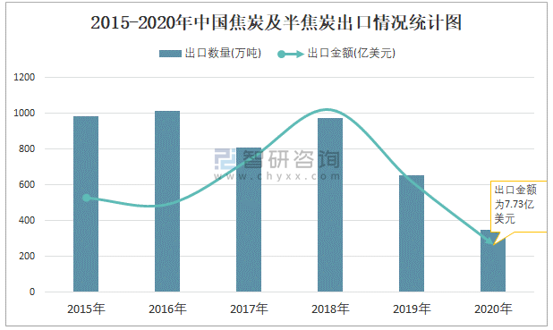 2015-2020年中國焦炭及半焦炭出口情況統計圖