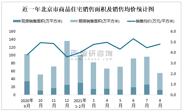 根據國家統計局數據可知:2021年8月北京市商品住宅銷售面積為55.38萬平方米(其中銷售現房12.74萬平方米,期房42.64萬平方米),銷售額為266.64億元,銷售均價約為4.81萬元/平方米;2021年1-8月北京市商品住宅累計銷售面積為563.77萬平方米,銷售面積累計同比增長51.8%,累計銷售額為2618.37億元,銷售額累計同比增長58.7%;近一年北京市商品住宅銷售均價2021年6月達到最高值,此后有所下滑,期房銷售面積遠高于現房銷售面積。