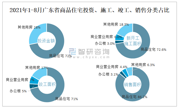 根據(jù)國(guó)家統(tǒng)計(jì)局?jǐn)?shù)據(jù)統(tǒng)計(jì)可知:2021年1-8月廣東省房地產(chǎn)開(kāi)發(fā)企業(yè)在商品住宅中投資金額占比為71.9%(注:只有投資金額中其他用房包含辦公樓、商業(yè)營(yíng)業(yè)用房),商品住宅的新開(kāi)工面積與竣工面積所占比重差異不大,從銷售面積來(lái)看,商品住宅為銷售主力(占比高達(dá)86.2%),辦公樓銷售面積占比少于商業(yè)營(yíng)業(yè)用房銷售面積占比。