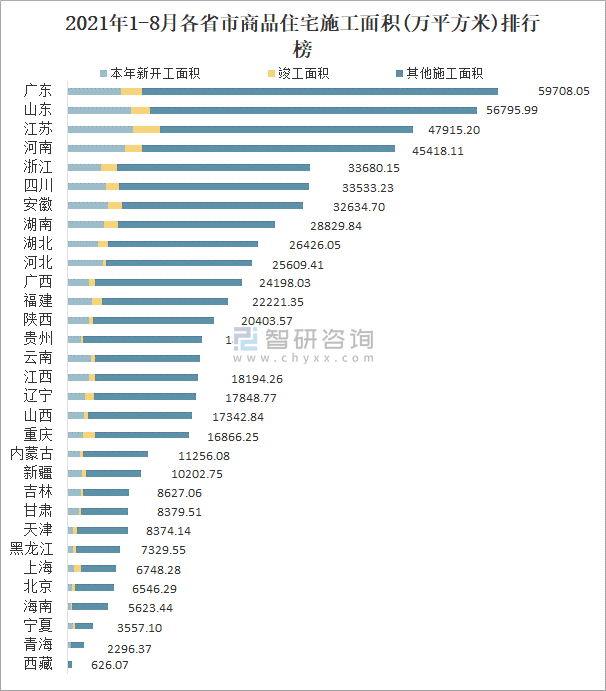 2021年1-8月各省市商品住宅施工面積(萬(wàn)平方米)排行榜