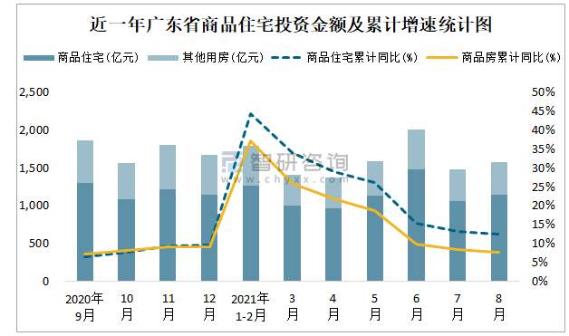近一年廣東省商品住宅投資金額及累計(jì)增速統(tǒng)計(jì)圖