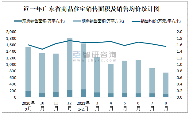 近一年廣東省商品住宅銷售面積及銷售均價(jià)統(tǒng)計(jì)圖