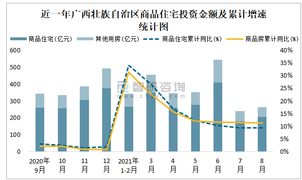 根據國家統計局數據統計可知:2021年8月廣西壯族自治區房地產開發投資商品房投資金額為262.38億元(其中商品住宅為207.01億元,辦公樓、商業營業用房等其他用房55.37億元);2021年1-8月廣西壯族自治區房地產開發投資商品住宅累計投資金額為1950.14億元,投資金額累計同比增長9.5%。