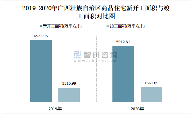 2019-2020年廣西壯族自治區商品住宅新開工面積與竣工面積對比圖