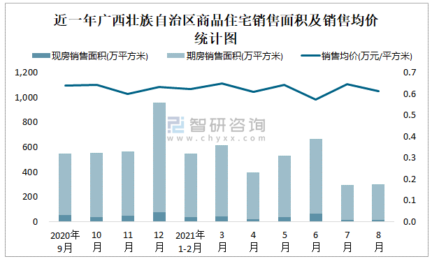 近一年廣西壯族自治區商品住宅銷售面積及銷售均價統計圖