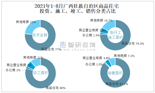 根據國家統計局數據統計可知:2021年1-8月廣西壯族自治區房地產開發企業在商品住宅中投資金額占比為76.5%(注:只有投資金額中其他用房包含辦公樓、商業營業用房),商品住宅的新開工面積與竣工面積所占比重差異不大,從銷售面積來看,商品住宅為銷售主力(占比高達87.1%),辦公樓銷售面積占比少于商業營業用房銷售面積占比。