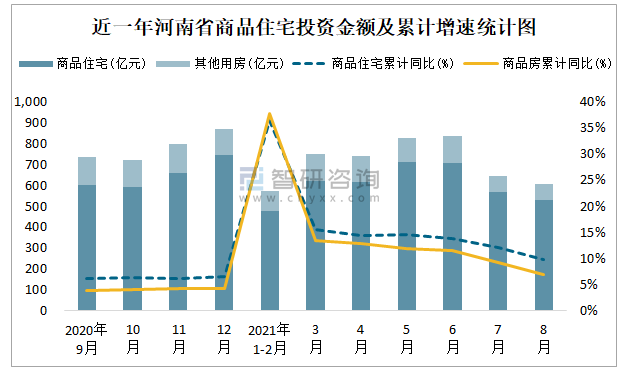 根據國家統計局數據統計可知:2021年8月河南省房地產開發投資商品房投資金額為608.190000000001億元(其中商品住宅為531.59億元,辦公樓、商業營業用房等其他用房76.6億元);2021年1-8月河南省房地產開發投資商品住宅累計投資金額為4231.3億元,投資金額累計同比增長9.8%。