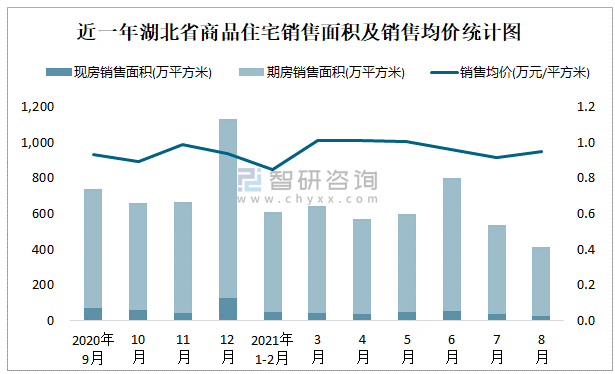 2021年8月湖北省銷售商品住宅412.38萬平方米 銷售均價約為0.95萬元/平方米