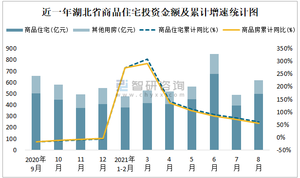 根據國家統計局數據統計可知:2021年8月湖北省房地產開發投資商品房投資金額為618.06億元(其中商品住宅為498.39億元,辦公樓、商業營業用房等其他用房119.67億元);2021年1-8月湖北省房地產開發投資商品住宅累計投資金額為3219.45億元,投資金額累計同比增長62.2%。
