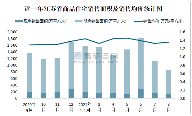根據國家統計局數據可知:2021年8月江蘇省商品住宅銷售面積為856.3萬平方米(其中銷售現房129.93萬平方米,期房726.37萬平方米),銷售額為1164.13億元,銷售均價約為1.36萬元/平方米;2021年1-8月江蘇省商品住宅累計銷售面積為9762.11萬平方米,銷售面積累計同比增長16.4%,累計銷售額為13618.49億元,銷售額累計同比增長26.2%;近一年江蘇省商品住宅銷售均價2021年5月達到最高值,此后有所下滑,期房銷售面積遠高于現房銷售面積。