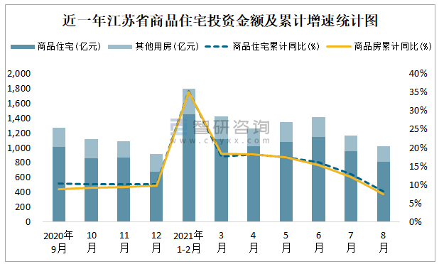 根據國家統計局數據統計可知:2021年8月江蘇省房地產開發投資商品房投資金額為1023.94億元(其中商品住宅為811.93億元,辦公樓、商業營業用房等其他用房212.01億元);2021年1-8月江蘇省房地產開發投資商品住宅累計投資金額為7579.23億元,投資金額累計同比增長8.2%。