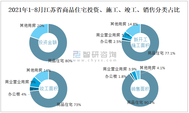 2021年1-8月江蘇省商品住宅投資、施工、竣工、銷售分類占比