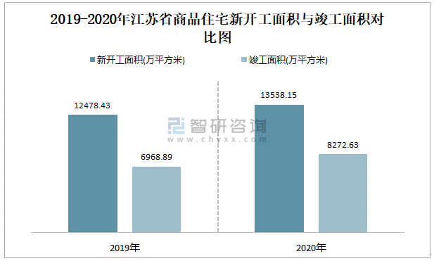 2019-2020年江蘇省商品住宅新開工面積與竣工面積對比圖