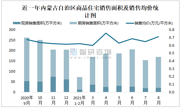 根據國家統計局數據可知:2021年8月內蒙古自治區商品住宅銷售面積為168.87萬平方米(其中銷售現房21.18萬平方米,期房147.69萬平方米),銷售額為120.41億元,銷售均價約為0.71萬元/平方米;2021年1-8月內蒙古自治區商品住宅累計銷售面積為1143萬平方米,銷售面積累計同比增長20.9%,累計銷售額為766.72億元,銷售額累計同比增長17.3%;近一年內蒙古自治區商品住宅銷售均價2021年3月跌至最低值,此后總體呈現上升趨勢,期房銷售面積遠高于現房銷售面積。