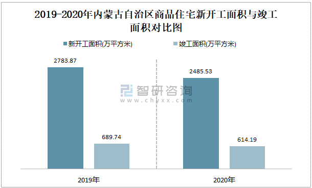 2019-2020年內蒙古自治區商品住宅新開工面積與竣工面積對比圖