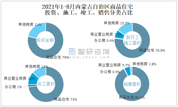 2021年1-8月內蒙古自治區商品住宅投資、施工、竣工、銷售分類占比