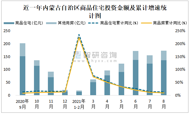 根據國家統計局數據統計可知:2021年8月內蒙古自治區房地產開發投資商品房投資金額為173.29億元(其中商品住宅為136.55億元,辦公樓、商業營業用房等其他用房36.74億元);2021年1-8月內蒙古自治區房地產開發投資商品住宅累計投資金額為629.98億元,投資金額累計同比增長13.4%。