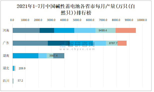 2021年1-7月中國堿性蓄電池各省市每月產量排行榜