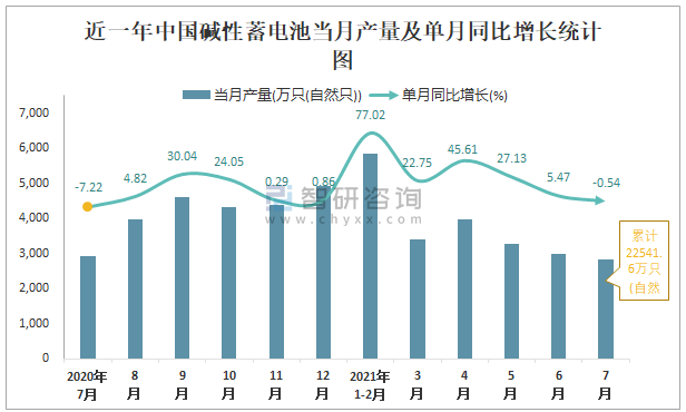 根據國家統計局數據顯示:2021年7月中國堿性蓄電池產量為2823萬只(自然只),同比下降0.54%;2021年1-7月中國堿性蓄電池累計產量為22541.6萬只(自然只),同比增長31.77%;2015-2020年中國堿性蓄電池產量2019年跌至最低,次年出現小幅度回升。