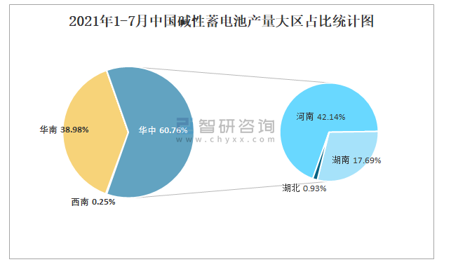 2021年1-7月中國堿性蓄電池產量大區占比統計圖