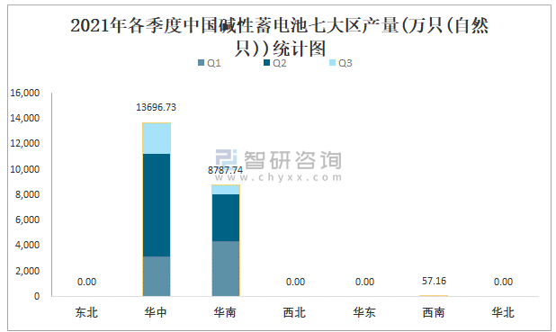 2021年各季度中國堿性蓄電池七大區產量統計圖