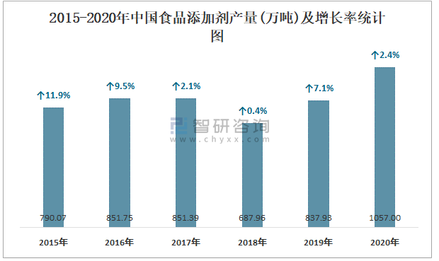 2015-2020年中國食品添加劑產(chǎn)量及增長率統(tǒng)計(jì)圖