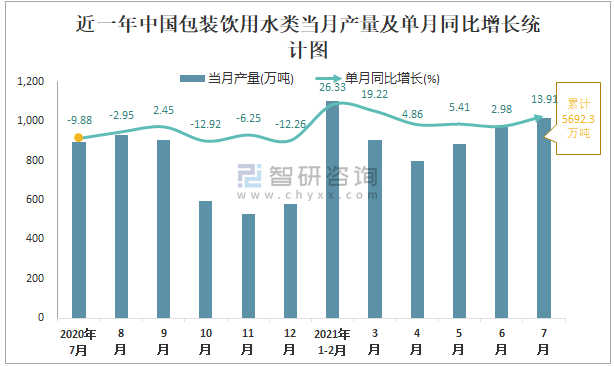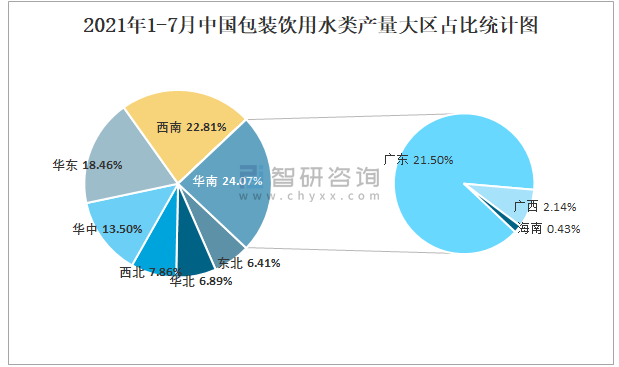 2021年1-7月中國包裝飲用水類產量為5692.3萬噸 華南地區產量最高(占比24.07%)