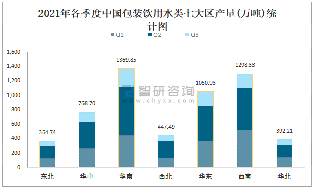 2021年各季度中國包裝飲用水類七大區產量統計圖