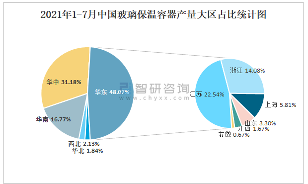 2021年1-7月中國玻璃保溫容器產量大區占比統計圖