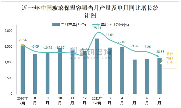 根據國家統計局數據顯示:2021年7月中國玻璃保溫容器產量為1140萬個,同比下降28.56%;2021年1-7月中國玻璃保溫容器累計產量為7697萬個,同比增長8.98%;2015-2020年中國玻璃保溫容器產量2016年達到最高,此后逐年遞減。