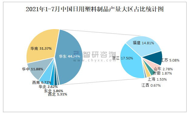 2021年1-7月中國日用塑料制品產量大區占比統計圖