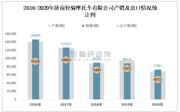 2016-2020年濟南輕騎摩托車有限公司產銷及出口情況統計圖