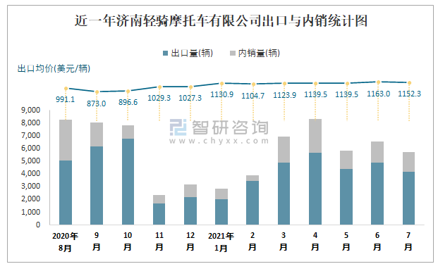 根據中國汽車工業(摩托車)產銷快訊數據統計可知:2021年7月中國摩托車產量總計為1721567輛,同比增長5.6%,銷量總計為1721887輛,同比增長4.26%,產銷率約為100.02%,清倉庫存-320輛,其中總計出口量為723084輛,內銷998803輛,出口均價約為633.62美元/輛。濟南輕騎摩托車有限公司作為擁有10-20年企齡的摩托車企業之一,7月銷量相較于同類型車企,排名比較靠后,且以出口為主。