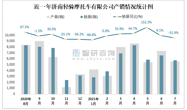 近一年濟南輕騎摩托車有限公司產銷情況統計圖