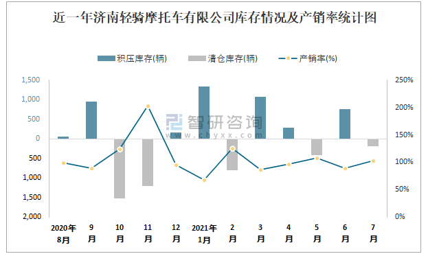 近一年濟南輕騎摩托車有限公司庫存情況及產銷率統計圖