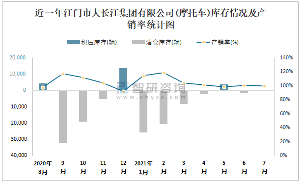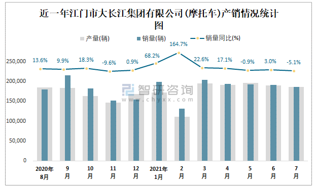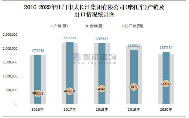 根據(jù)中國(guó)汽車(chē)工業(yè)(摩托車(chē))產(chǎn)銷(xiāo)快訊數(shù)據(jù)顯示:2021年7月江門(mén)市大長(zhǎng)江集團(tuán)有限公司(摩托車(chē))產(chǎn)量為186109輛,同比下降0.09%,銷(xiāo)量為186274輛,同比下降5.06%;2021年1-7月江門(mén)市大長(zhǎng)江集團(tuán)有限公司(摩托車(chē))累計(jì)產(chǎn)量為1240377輛,同比增長(zhǎng)27.86%,累計(jì)銷(xiāo)量為1295443輛,同比增長(zhǎng)29.01%;2016-2020年江門(mén)市大長(zhǎng)江集團(tuán)有限公司(摩托車(chē))銷(xiāo)量2017年達(dá)到最高值,此后逐年遞減,且近5年總產(chǎn)量大于總銷(xiāo)量,積壓了庫(kù)存4683輛,出口量偏少,銷(xiāo)量以?xún)?nèi)銷(xiāo)為主。