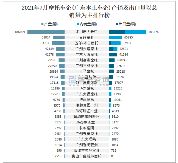 2021年7月摩托車企(廣東本土車企)產(chǎn)銷及出口量(以總銷量為主)排行榜
