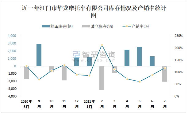近一年江門市華龍摩托車有限公司庫存情況及產(chǎn)銷率統(tǒng)計圖